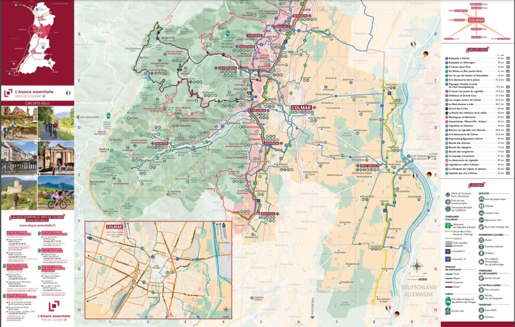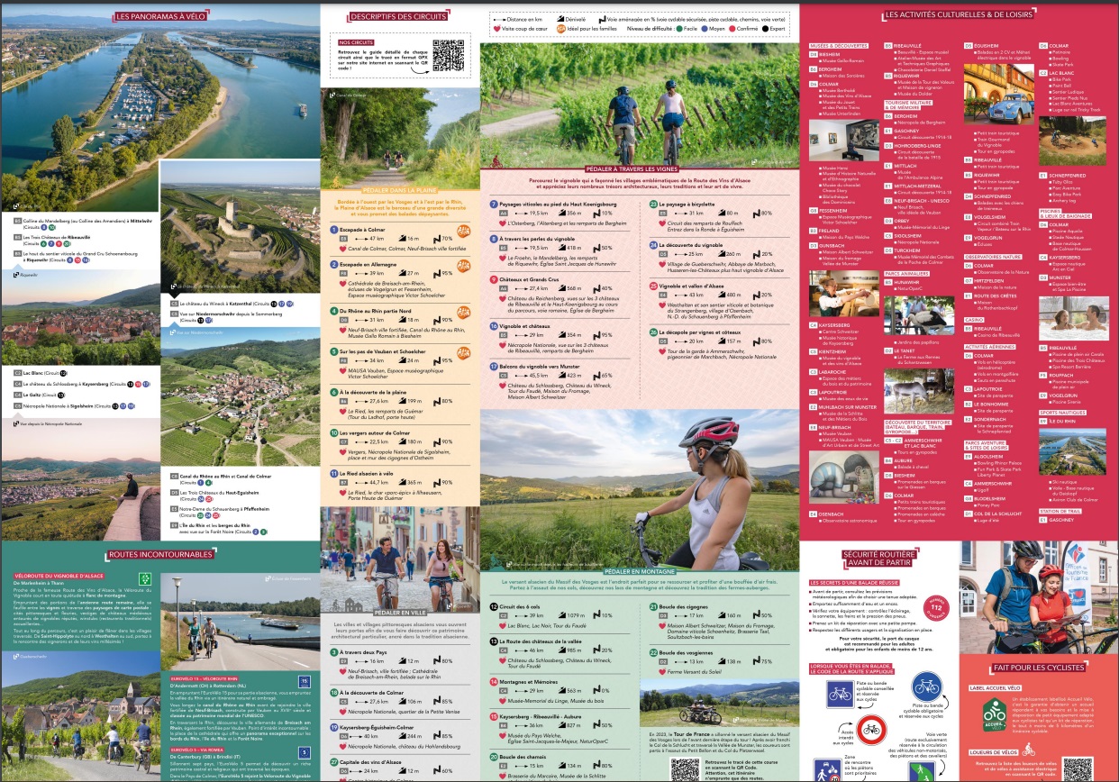 De Neuf Brisach à Munster, de Ribeauvillé à Rouffach, le long de canaux, en plaine, en ville, dans le vignoble ou en montagne, cette carte s’adresse aux habitants, comme aux touristes, aux sportifs comme aux familles et a pour vocation de faire découvrir ou redécouvrir la région colmarienne autrement…